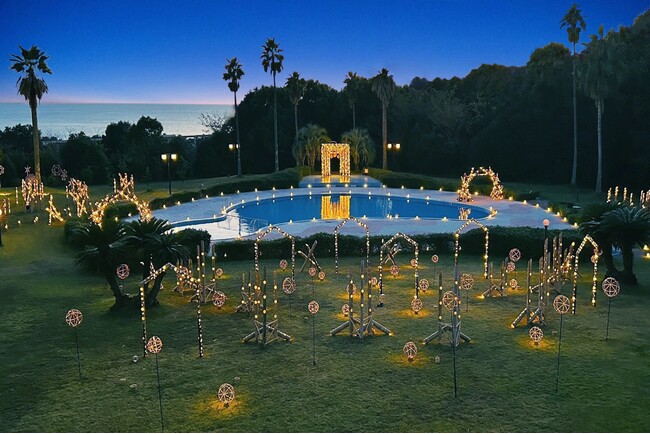1. プールサイドに浮かび上がる約100基の竹灯りのオブジェ