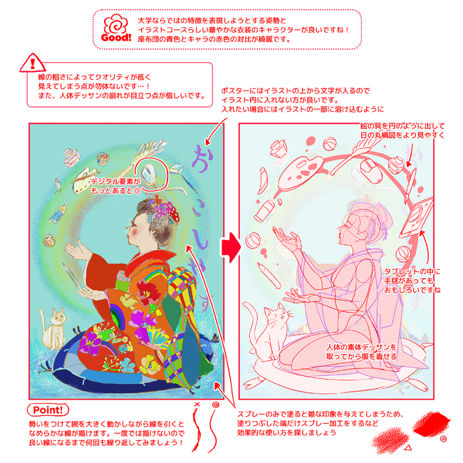 講師陣からの提出作品、課題への個別添削の一例。良い点と改善点などがきめ細かく書き込まれている。