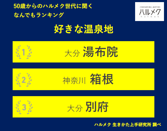 【50歳からのハルメク世代に聞く なんでもランキング】50歳以上の女性が選ぶ「好きな温泉地」 TOP3は「湯布院」「箱根」「別府」