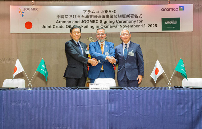 JOGMEC(本部:東京都港区、理事長:高原一郎)は、資源エネルギー庁立ち合いのもと、アラムコ(本社:サウジアラビア王国ダーラン、社長兼CEO:アミン・ナセル氏)と2025年 11 月12 日、署名式会場である沖縄において、原油タンク貸借等に係る更新契約を締結しました。