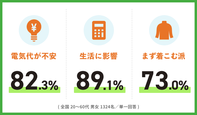 その結果、8割以上(82.3%)が「この冬の電気代が不安」と回答し、「電気代が家計に影響する」と答えた人は、全体で約9割(89.1%)にのぼりました。寒さを感じた際の行動では、暖房より「まず着こむ」とする人が多数派となり、生活の中で我慢する姿勢が見られました。