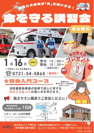 株式会社ベルコ堺支社・河内長野支部代理店(所在地:大阪府河内長野市)は、地域住民を対象とした『命を守る講習会(救命入門コース)』を 2025年1月16日(金) に開催いたします。参加費は無料で、事前予約制・定員20名となります。