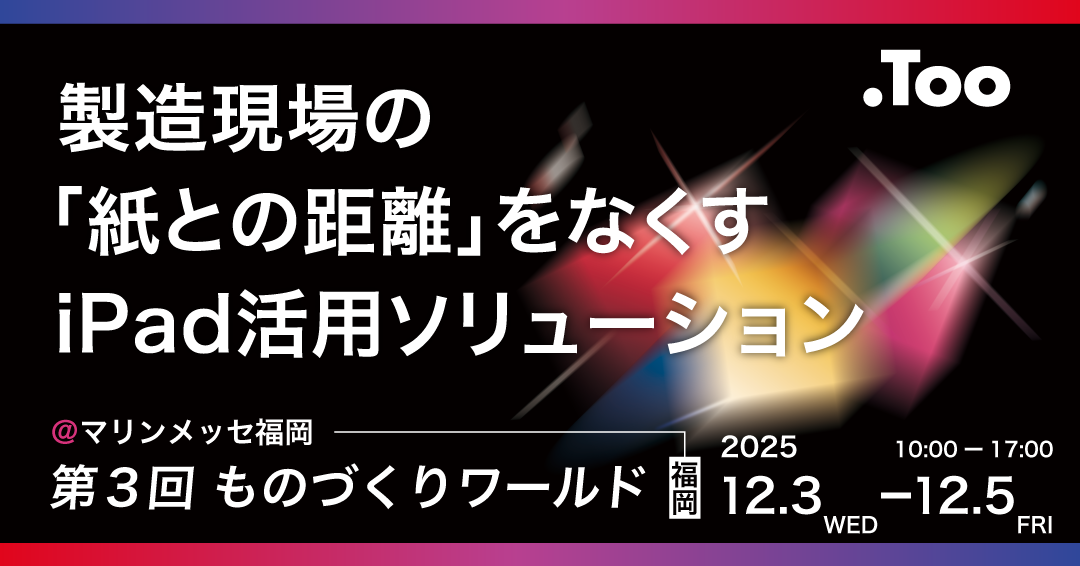 クリエイティブ市場の総合商社・株式会社Too(本社/東京都港区虎ノ門3-4-7、社長/石井剛太、以下Too)は、2025年12月3日(水) - 5日(金)にマリンメッセ福岡で開催される「第3回 ものづくりワールド 福岡」の「製造業DX展」に出展します。