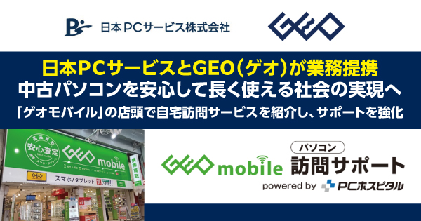 デジタル機器の設定・トラブル解決を行う日本PCサービス株式会社(本社:大阪府吹田市、代表取締役社長:家喜 信行、証券コード:6025、以下「当社」)は、株式会社ゲオ(本社:愛知県名古屋市中区、代表取締役社長:村上 幸正、以下「ゲオ」)と業務提携します。2025年11月20日(木)より「ゲオモバイル」店舗で取り扱う中古パソコンの購入者向けアフターサポートを拡充すべく『GEO mobile訪問サポート powered by PCホスピタル』のご案内を開始します。