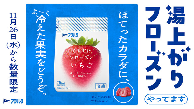 アヲハタ株式会社(本社:広島県竹原市、代表取締役社長:上田敏哉、以下アヲハタ)は、“凍ったままでやわらかい”冷凍フルーツ「アヲハタ くちどけフローズン」をお風呂あがりに楽しんで頂くイベント「湯上がりフローズン」を、11月26日の「いい風呂の日」に合わせ全国18箇所の銭湯・温浴施設にて期間限定で実施します。