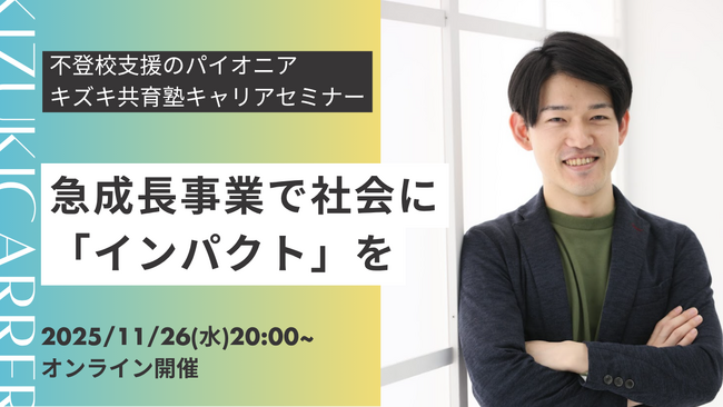 株式会社キズキ(本社:東京都新宿区、代表取締役:安田祐輔)が運営するキズキ共育塾は、不登校・発達特性・学び直しなど、さまざまな背景を持つ子どもたちや若者に寄り添い、“何度でもやり直せる社会”をつくることを目指す企業です。この度、 2025年11月26日(水)20:00~21:00 にキズキ共育塾での正社員採用向けキャリアセミナーを開催します。今回のキャリアセミナーでは、不登校や発達特性、学び直しなど、多様な背景を持つ若者に真摯に向き合う教育事業に共感し、社会的インパクトのある仕事にチャレンジしたい方々を対象としています。