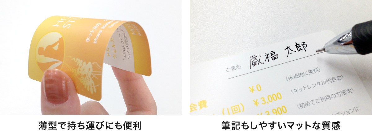 プラスチックカード印刷の特徴は、薄型で持ち運びにも便利で、筆記もしやすいマットな質感です。