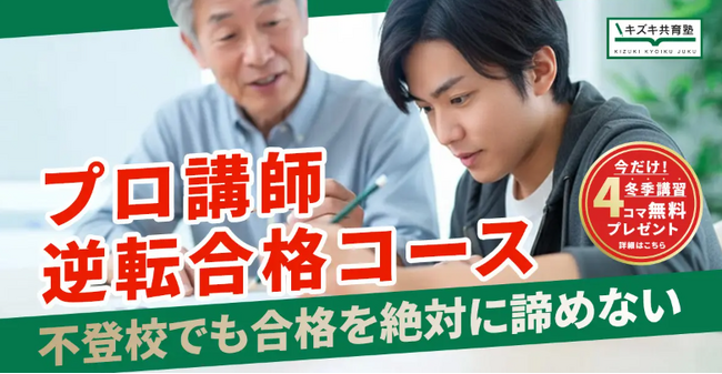 不登校支援歴15年の完全個別指導塾・キズキ共育塾が、短期集中で合格・学力アップを叶えたいお子さんに向けた【プロ講師逆転合格コース】を11月申込限定で実施中!不登校から受験合格へプロ講師が導きます!