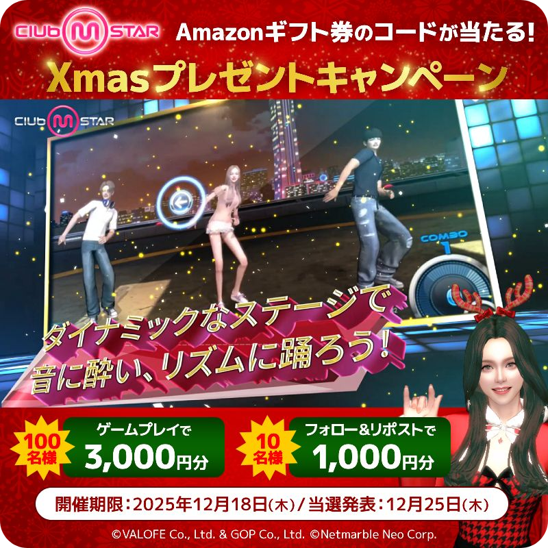 株式会社G・O・P[本社:東京都新宿区、代表取締役社長:申 載明(シン・ジェミョン)]は、PC向けオンラインダンスゲーム『Club M Star』(以下、クラブ・エム・スター)において、2025年11月20日(木)より「Xmasプレゼントキャンペーン」を開催します。