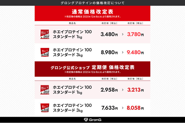サプリメントやトレーニング器具の販売などをおこなう株式会社Ultimate Life(本社:大阪市東成区、代表取締役社長:田中 悠貴)は、2025年12月8日(月)に、GronG(グロング)ブランドの一部ホエイプロテイン商品の価格を、以下の通り改定します。