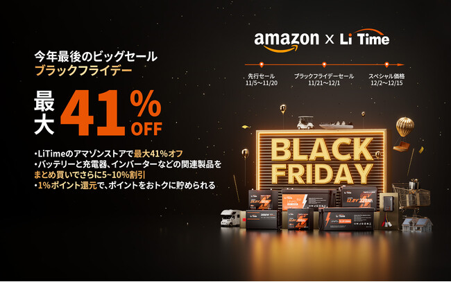 エネルギーソリューションを提供するブランドLiTimeは、Amazonにて開催されるブラックフライデーセール(11月21日 ~ 12月1日)に参加いたします。セール期間中は、LiTimeのリン酸鉄バッテリー、充電器、インバーター、MPPTコントローラー、ハイブリッドインバーターなどの人気商品が最大41%OFFになります。さらに、まとめ買いの追加割引やポイント還元などのキャンペーンを実施します。一部の商品は年度最安値を更新しました。