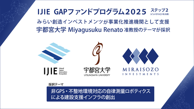国立大学法人宇都宮大学(学長:池田宰) Renato Miyagusuku(ミヤグスク レナート)准教授の研究テーマ「非GPS・不整地環境対応の自律測量ロボティクスによる建設支援インフラの創出」が、科学技術振興機構(JST)「大学発新産業創出基金スタートアップ・エコシステム共創プログラム 地域プラットフォーム共創支援」の採択プログラムのInland Japan Innovation Ecosystem(IJIE)「GAPファンドプログラム2025 ステップ2 インパクトビジネス枠」に採択されました。株式会社みらい創造インベストメンツ(代表取締役社長:岡田 祐之、以下「みらい創造インベストメンツ」)は本テーマについて事業化推進機関として伴走し、技術の事業化、スタートアップ創業を目指します。