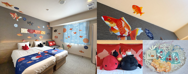 H.I.S.ホテルホールディングス株式会社(本社:東京都港区、以下HISHH)が運営する、変なホテル東京 西葛西は、「金魚ルーム」を11月21日(金)より発売します。本件の発売により、HISHHで展開するコンセプトルームは、ホテル業界最大級の71種類となります。「金魚ルーム」は、ホテルが立地する江戸川区が「金魚のふるさと」として知られることから、「街とつながる・地域文化との共創」をテーマに、「金魚が泳ぐ、アートな癒し空間」をコンセプトとした、客室全体に金魚をデザインした客室です。ご宿泊のお客様には、金魚すくい飴、金魚の形のバスボム、金魚のステッカーなどをプレゼントします。