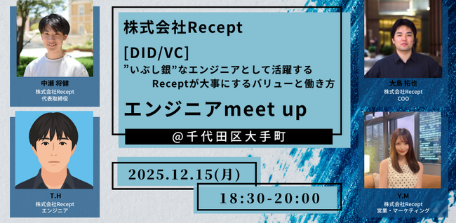本イベントは、DID/VCやスタートアップに関心を持つエンジニアが気軽に知見を共有し、交流できるカジュアルなMeetupです。第3回となる今回は、Receptが展開するDID/VC事業「proovy」を題材に、経営陣やリードエンジニアが「スタートアップで“いぶし銀”なエンジニアとして働くこと」をテーマに語ります。