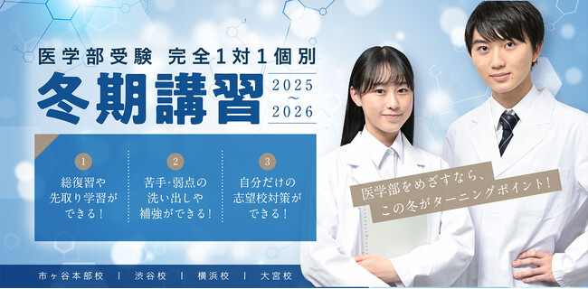 医学部合格をめざすなら、新学年に上がる前のこの冬がターニングポイント。完全1対1個別冬期講習から、あなたのためだけの“確実な医学部合格への対策”をスタートしましょう。