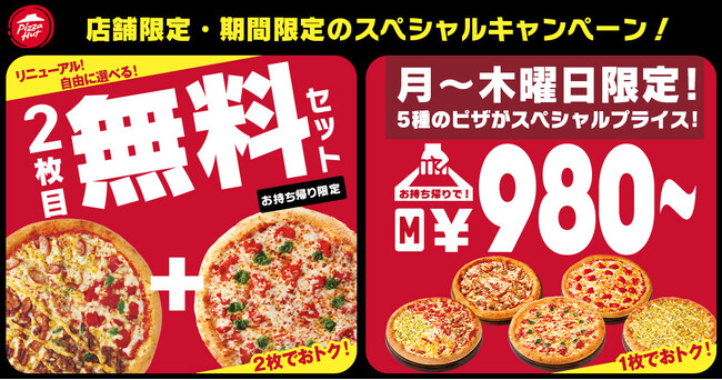 【見つけたら即GO】ピザハットが一部店舗限定“お持ち帰り革命!”「2枚買うと1枚無料」が組み合わせ自由に!1枚なら「月~木曜日限定980円ピザ」も!