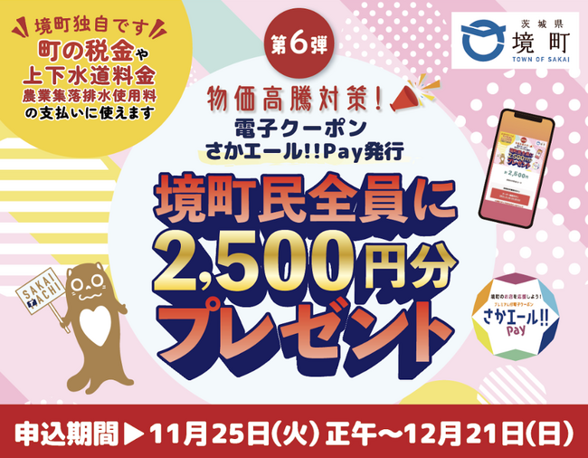 Gigi株式会社(代表取締役:今井了介、所在地:東京都港区)は、茨城県境町(町長:橋本正裕)と連携し、物価高騰対策として境町の全町民に向けて、第6弾「電子クーポンさかエール!!Pay2500円分プレゼント」を2025年12月8日(月)より順次発行、並びに「町内事業者及び農業者支援プレミアム付電子クーポン「さかエール!!︎Pay」」の申し込みを2025年12月15日(月)正午12時00分より開始します。