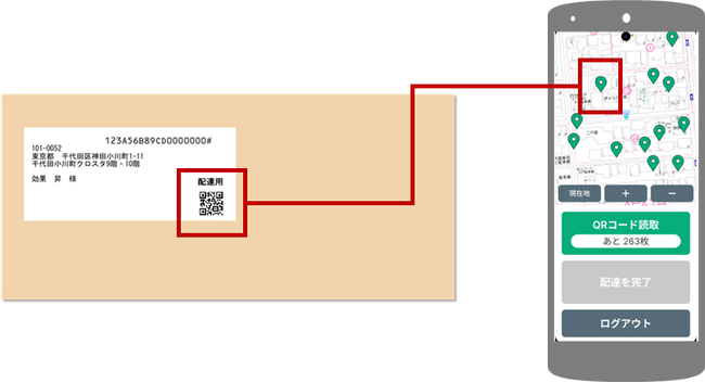 配達員は、あらかじめ宛名とともに印字された2次元コードを読み取り、スマートフォン上の地図にマーキングすることで、配達先を、視覚的に分かりやすく確認することができます。