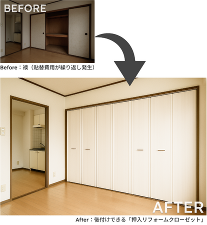 貼替費用が繰り返し発生しやすい襖を、撤去工事なしでクローゼット化。内見時の印象が改善し、収納量が増えることで入居者の満足度向上にもつながります。