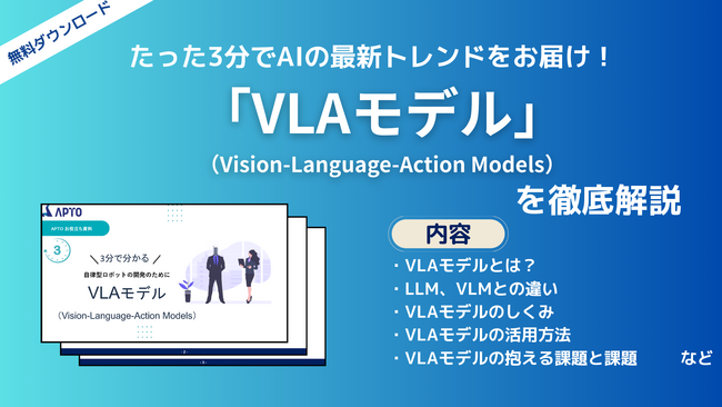 株式会社APTO(本社:東京都、代表取締役:高品良)は、ロボティクスや自動運転技術に使われる「VLAモデル」に関する資料を無料で公開いたしました。