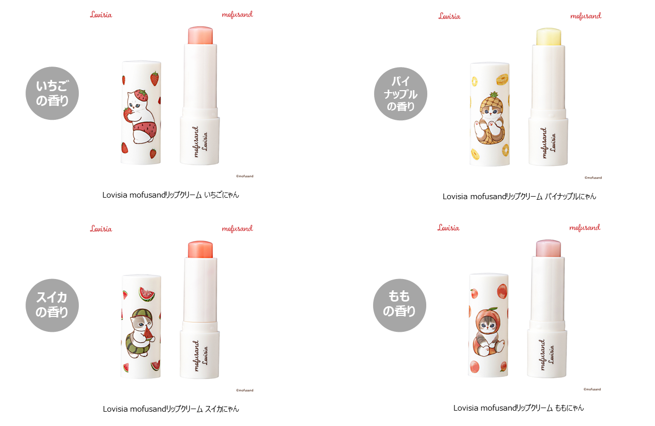 『Lovisia mofusandリップクリーム』(全4種)は、いちご、パイナップル、スイカ、もものフルーツになりきったにゃんこたちの可愛いパッケージデザインで、みずみずしくなめらかな塗り心地です。アセロラエキス(※1)、シアバター(※2)、ヒマワリオイル(※3)の3種の潤い成分を配合し、唇の乾燥を防ぎます。落ち着いたくすみカラーを基調としたパッケージは、フルーツモチーフながらも秋冬の季節に馴染むデザインとなっています。