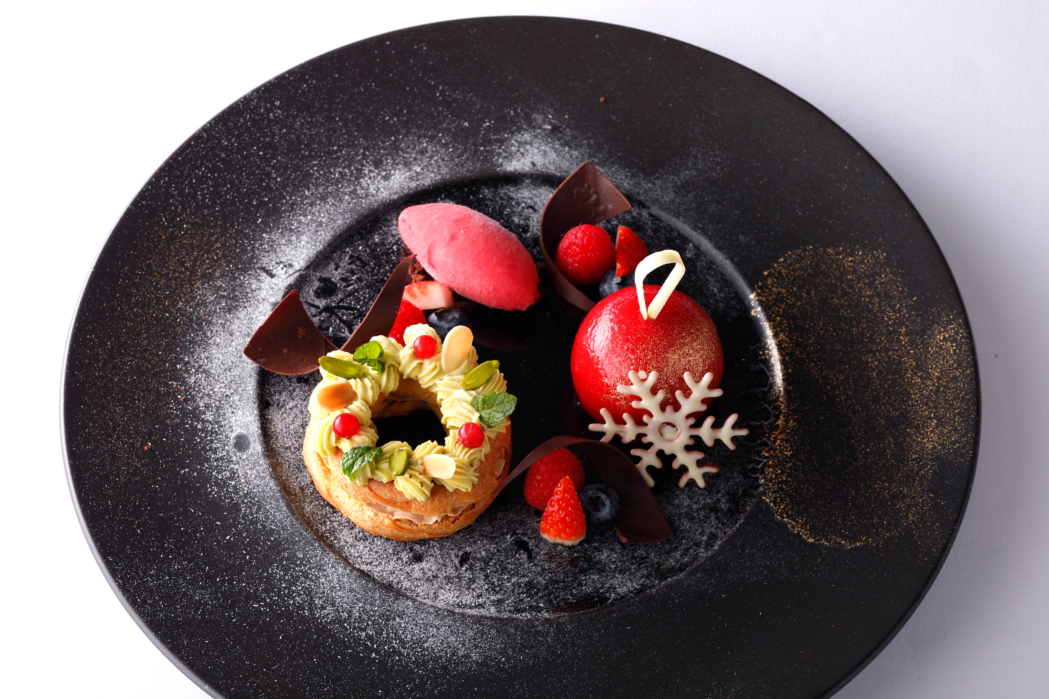 ベリーの甘酸っぱさとナッツの香ばしさがぎゅっと詰まった、クリスマス限定のスペシャルプレート。甘酸っぱいフランボワーズのソルベとともに、さまざまな味が楽しめます。まるでクリスマスプレゼントのような、心ときめくひと皿です。