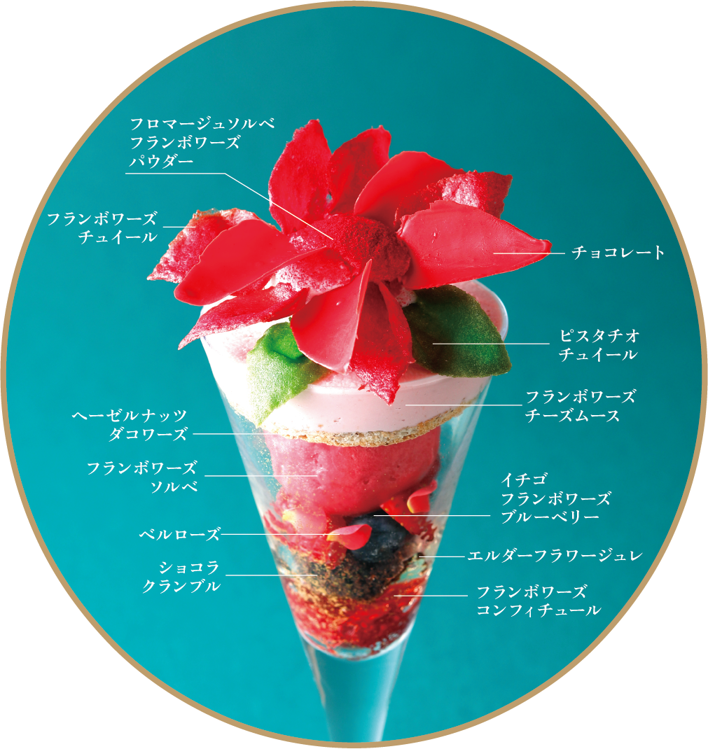 クリスマスの象徴「ポインセチア」をイメージした、華やかなスペシャルパフェ。フロマージュとベリーのハーモニー、エルダーフラワーのさわやかな味わいがクリスマス気分を盛り上げます。季節の彩りを感じながら、優雅なデザートタイムをお楽しみください。