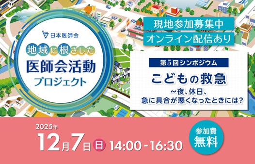 日本医師会(会長:松本吉郎)では、「こどもの救急~夜、休日、急に具合が悪くなった時には?」をテーマに、12月7日(日)午後2時より「地域に根ざした医師会活動プロジェクト 第5回シンポジウム」を開催いたします。