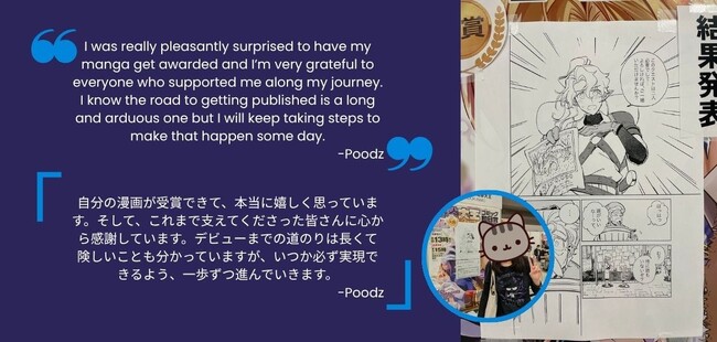 今回、Poodz の受賞および「月刊コミック 電撃大王」での読み切り掲載決定は、当プロジェクトにとっても大きな成果であり、「世界から日本の商業誌へ」という新しいロールモデルの一つになると考えています。今後も、さらなる受賞・連載獲得者を輩出できるよう、プログラムの拡充とサポート体制の強化を進めてまいります。