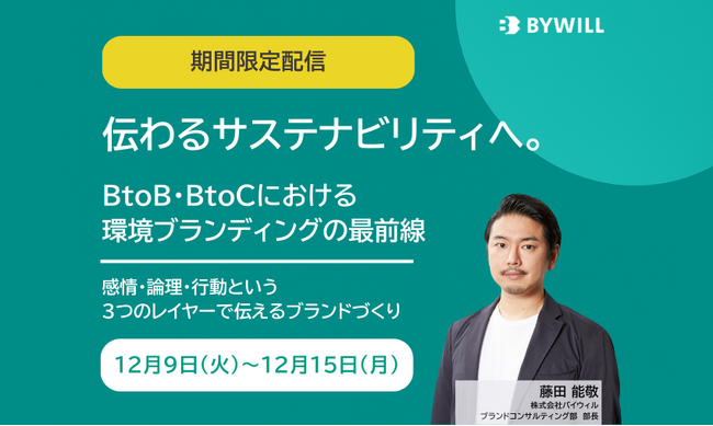 日本のカーボンニュートラル実現を目指し、脱炭素コンサルティングやカーボンクレジットの創出・販売を行う株式会社バイウィルは、無料セミナー「伝わるサステナビリティへ。BtoB・BtoCにおける環境ブランディングの最前線」を、2025年12月9日(火)から2025年12月15日(月)の期間限定でオンラインにて公開いたします。※本セミナーは、2025年4月23日(水)に開催されたウェビナーを期間限定で公開するものです。