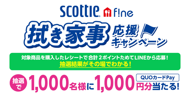 日本製紙グループの日本製紙クレシア株式会社〔住所:東京都千代田区神田駿河台4-6、代表取締役社長:安永敦美〕は、スコッティのキッチン商品ブランドであるスコッティ ファインにおいて2025年12月1日(月)から2026年2月28日(土)の期間、「スコッティ ファイン 拭き家事応援キャンペーン」を実施いたします。対象商品を購入したレシートで2ポイントをためて応募、抽選で1,000名様に「QUOカードPay1,000円分」がその場で当たります。