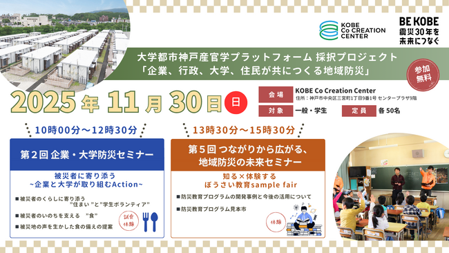 2025年11月30日(日)の午前中に企業・大学防災セミナーを、同日午後に地域防災の未来セミナーをKOBE Co CREATION CENTER(神戸市中央区)で開催します。これらのセミナーは、一般社団法人大学都市神戸産官学プラットフォーム採択プロジェクト「企業、行政、大学、住民がともにつくる地域防災」の取り組みの一つです。