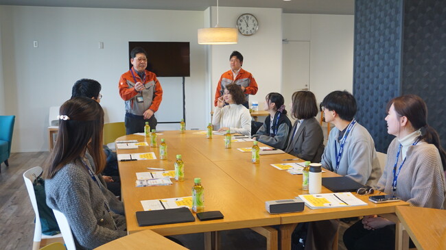 11月19日に実施されたキックオフでは、4名の学生(大分、兵庫、岡山、鳥取出身)と当社社員が一堂に会しました。 当日は、本プログラムを経験して当社に入社した3名の先輩社員との座談会も実施。学生たちはロールモデルとなる先輩の話に熱心に耳を傾け、終始やる気に満ちた様子でした。 参加した学生からは、「広くておしゃれなランチホールを、単なる食事をするだけの場所ではなく、社員が積極的に利用できる『社内サードプレイス』としてどう活用するか。0から企画して創り上げることへのプレッシャーもありますが、それ以上に楽しみです」といった、実践に向けた意欲的な言葉も聞かれました。