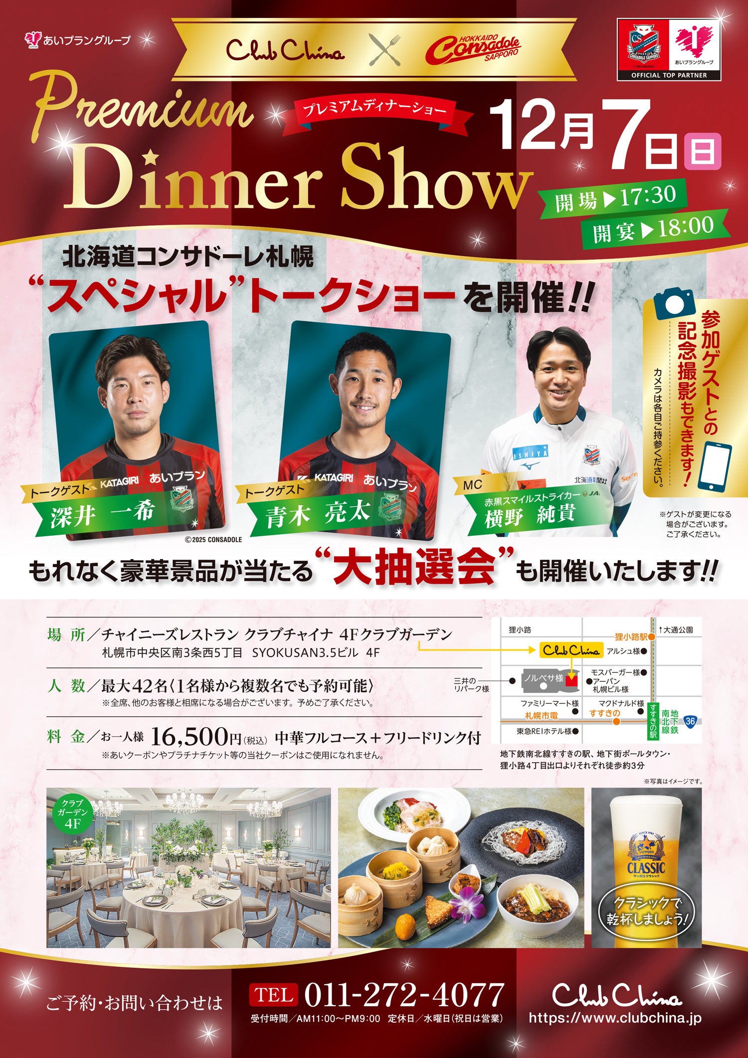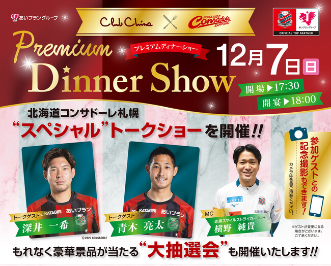 あいプラングループが運営する中国料理レストラン「クラブチャイナ」(札幌市中央区)は、北海道コンサドーレ札幌とのコラボレーション企画として、「Premium Dinner Show(プレミアムディナーショー)」を2025年12月7日(日)に開催いたします。