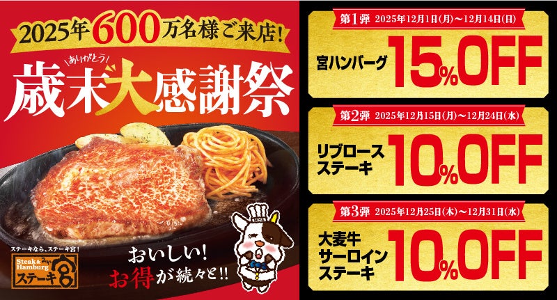 コロワイドグループの株式会社アトム(本社:神奈川県横浜市、代表取締役社長:植田剛史)が展開するステーキ宮では、2025年12月1日(月)よりチラシに付いたご優待券または公式HP該当ページを提示したお客様限定で、歳末大感謝祭を実施いたします。