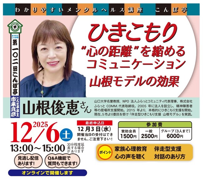 【NPO法人地域精神保健福祉機構・コンボ主催】第102回こんぼ亭月例会『ひきこもり: "心の距離"を縮めるコミュニケーション~山根モデルの効果~』(2025/12/06; オンライン開催)