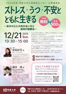 明星(めいせい)大学(東京都日野市、学長:冨樫 伸)心理相談センターでは、「ストレス・うつ・不安とともに生きる ―自分の心との向き合い方と認知行動療法―」と題して、公開講演会(オンライン)を実施します。