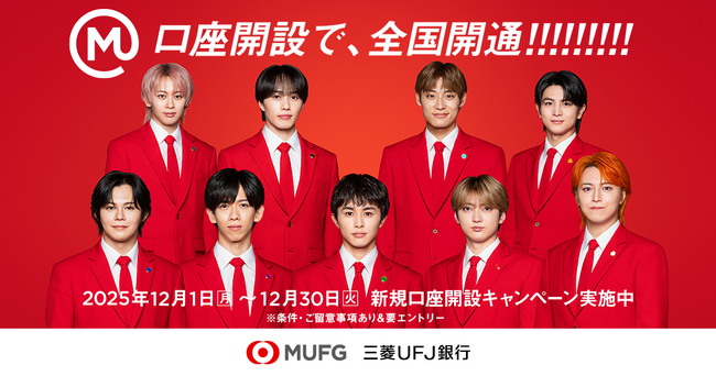 株式会社三菱UFJフィナンシャル・グループ(以下、MUFG)の連結子会社である株式会社三菱UFJ銀行(以下、当行)は、人気アイドルグループ「超特急」とのタイアップキャンペーンを2025年12月1日(月)より開始します。本キャンペーンは、「超特急と3,234(みつびし)件をめざそう!口座開設で、全国開通!!!!!!!!!」をキャッチコピーに、ファンと当行が一緒に楽しみながら作り上げていく共創型プロジェクトです。