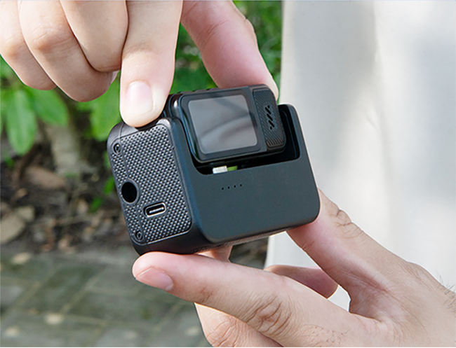 約40分で満充電が可能です。さらに、500回の充放電を線り返しても最大容量の80%を維持します。最大1時間の連続動画撮影に対応(2.7K/1080P・30FPS)