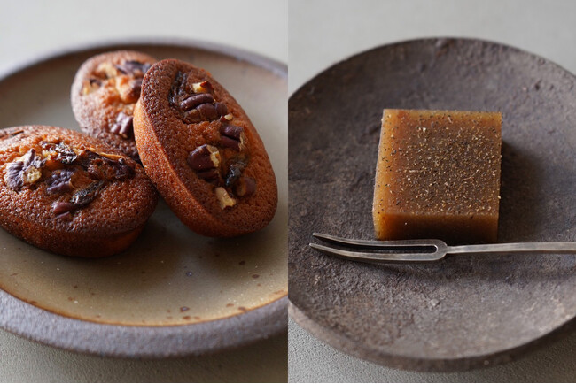 「フィナンシェ・デーツ」330 円(税込)と「デーツとほうじ茶の羊羹」300 円(税込)