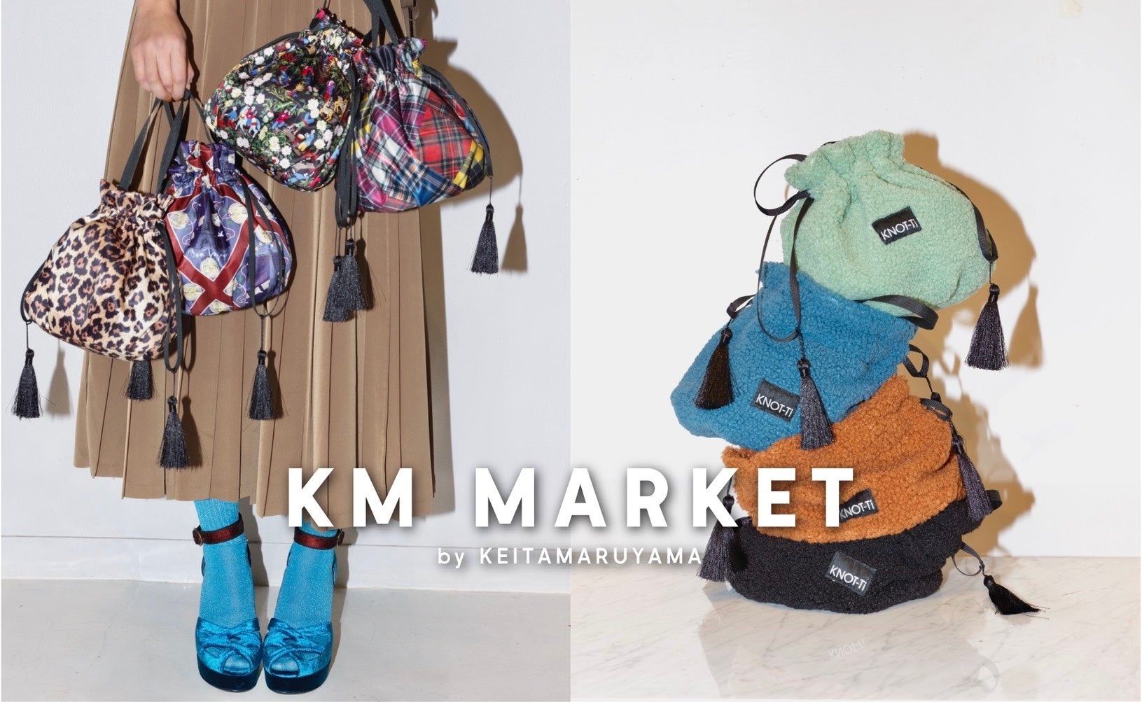 KEITAMARUYAMAが展開するデイリーライン KM MARKET(ケーエムマーケット) は、人気アイテム〈KNOT-Ti(ノッティ)〉巾着バッグの新作として、秋冬シーズンにぴったりの “ボア素材”を発売いたします。同時に、新たなアーカイブテキスタイルを活かした新作3種類も登場。