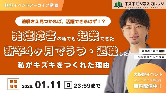 就労移行支援事業所・キズキビジネスカレッジ(KBC)は、2025年11月29日(土)に開催した、「うつ・発達障害経営者の仕事術:適職さえ見つかれば、活躍できるはず」をテーマとしたオンライン講演の様子を収めた、アーカイブ動画を期間限定で無料配信いたします。