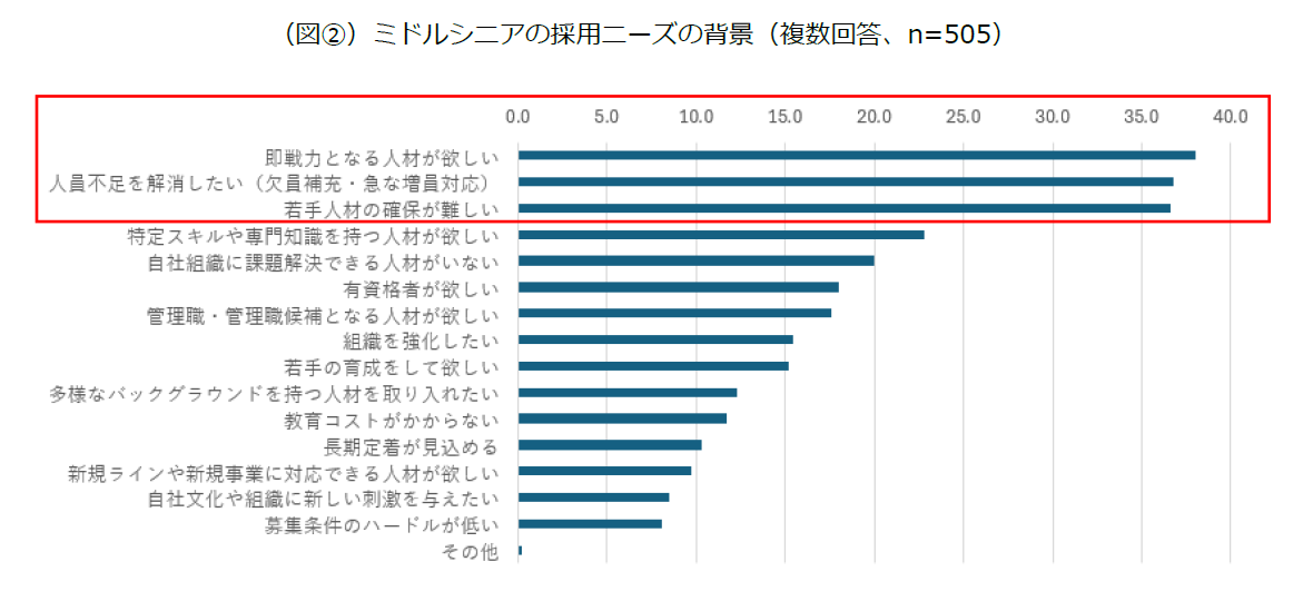 ミドルシニア採用ニーズの背景、1位は「即戦力人材の確保」。2位は「人材不足」3位は「若手人材の採用難」