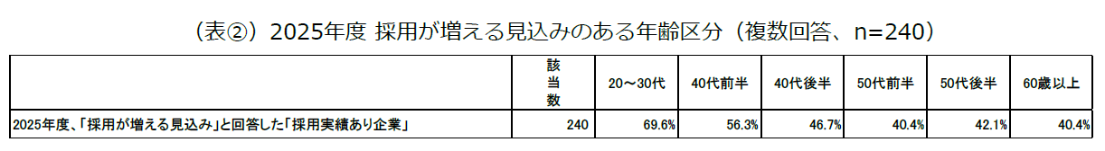 続いて、「採用実績あり企業」のうち、2025年度にいずれかの年齢区分で「採用が増える見込みがある」とした企業240社を対象に、年齢区分別の採用見込みを聞いたところ、最も多かったのは20~30代(約7割)でした。加えて、40代後半以上の採用についても、40代後半(46.7%)、50代前半(40.4%)、50代後半(42.1%)、60歳以上(40.4%)と、4割以上の企業が採用増加を見込んでいることが分かりました(表2.)。この結果から、「採用実績あり企業」では、若年層だけでなくミドルシニアや60歳以上のシニア層の採用にも前向きな姿勢を示していることがわかります。