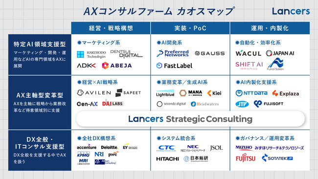 本マップは、ランサーズ・ストラテジック・コンサルティング株式会社の代表取締役社長CEO 和田千弘が監修。「特定AI領域支援型」「AX主軸型変革型」「DX全般・ITコンサル支援型」の3つの支援スタイルを軸に、AI時代の事業変革を支えるコンサルティング領域の最新動向を可視化しています。