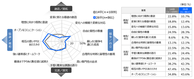 ・一回り前の世代にあたる2014年卒の結果と比較すると、『協調/親和』の方向へとグラフが張り出し、「理想に向かう情熱と意欲」「変革と新たな価値の創造」といった『創造/開拓』カテゴリーにある要素は減少。