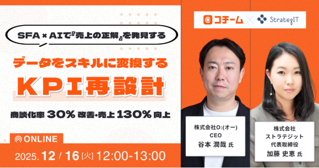 株式会社ストラテジット(本社:東京都港区、代表取締役社長:加藤 史恵、以下当社)は、株式会社O:(オー)(所在地:東京都中野区、代表:谷本 潤哉、以下「オー」)と共催で、2025年12月16日(火)12:00~13:00に、営業成果向上をテーマとした無料オンラインウェビナーを開催いたします。