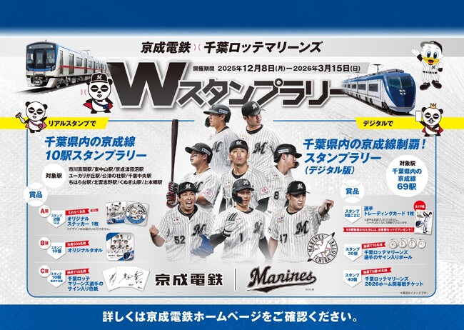 京成電鉄(本社:千葉県市川市、社長:天野 貴夫)では、2025年12月8日(月)~2026年3月15日(日)の期間中、「京成電鉄・千葉ロッテマリーンズWスタンプラリー」を開催します。