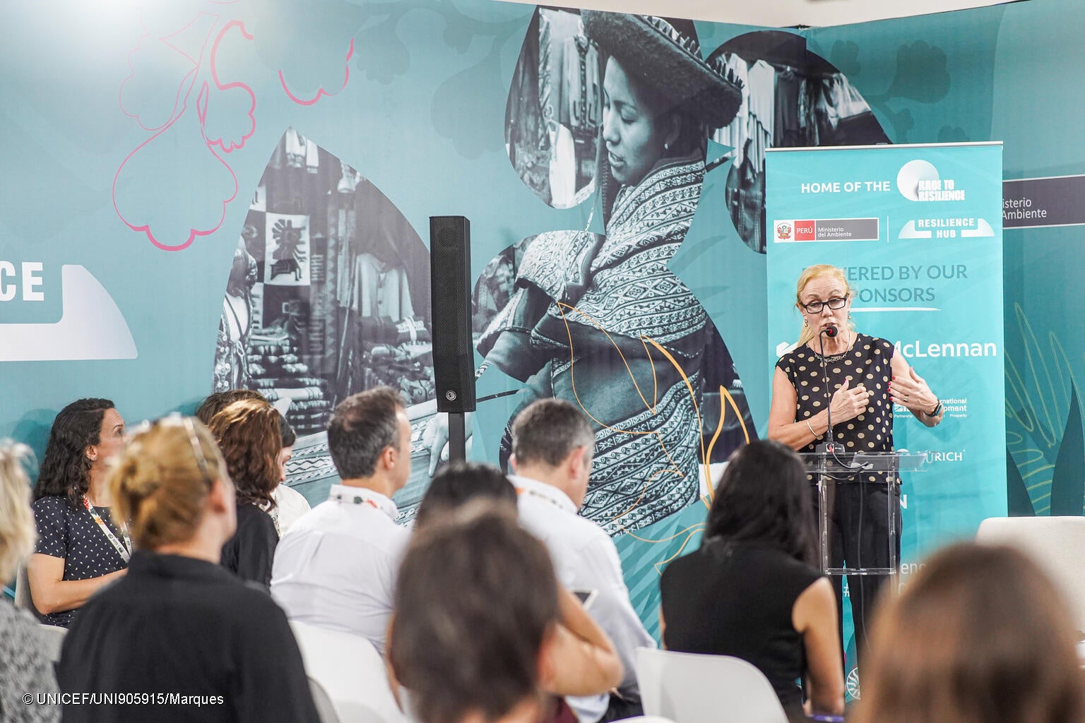 COP30の会場でスピーチをするファン・デル・ハイデン事務局次長(ブラジル。2025年11月12日撮影) (C) UNICEF/UNI905915/Marques
