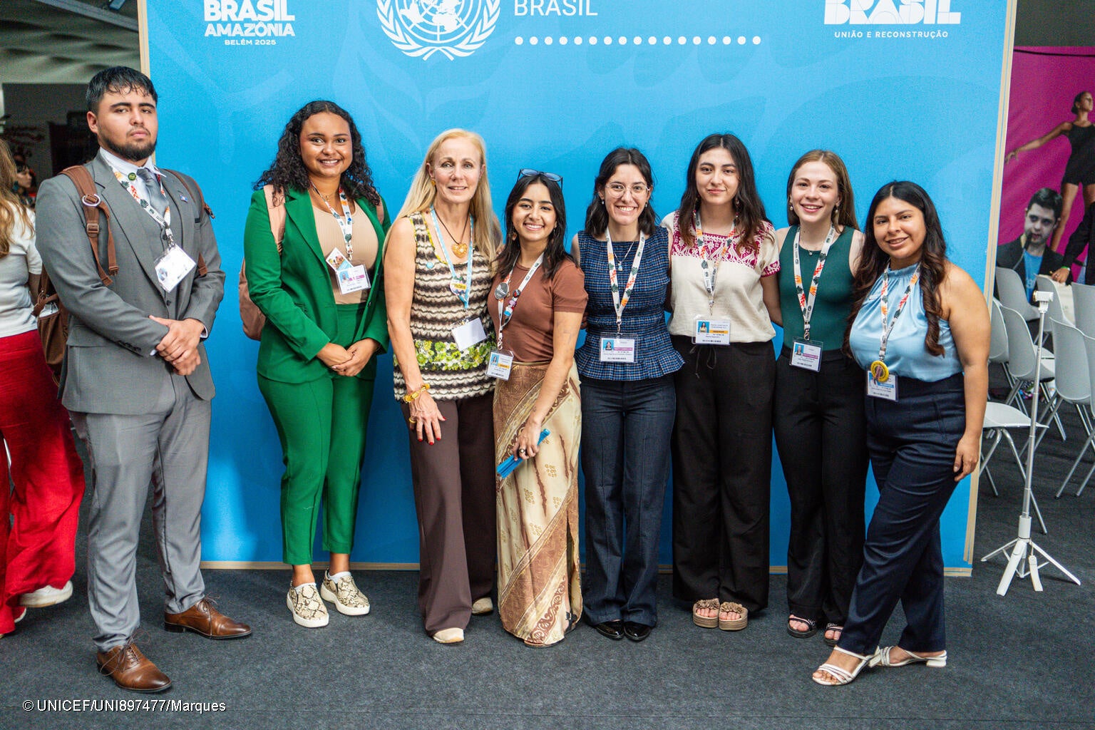 COP30で日本の子ども・若者からの提言を届けたファン・デル・ハイデン事務局次長(左から3番目)と、ユニセフと共に活動するラテンアメリカ・カリブ海地域の若者たち(ブラジル、2025年11月10日撮影) (C) UNICEF/UNI897477/Marques
